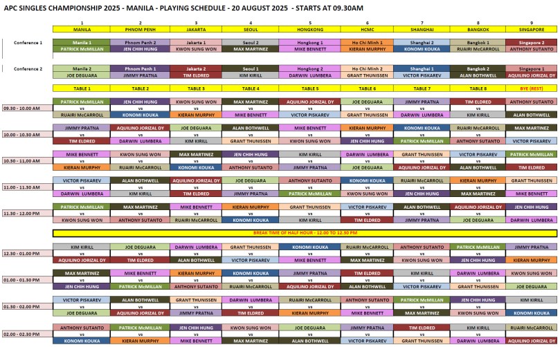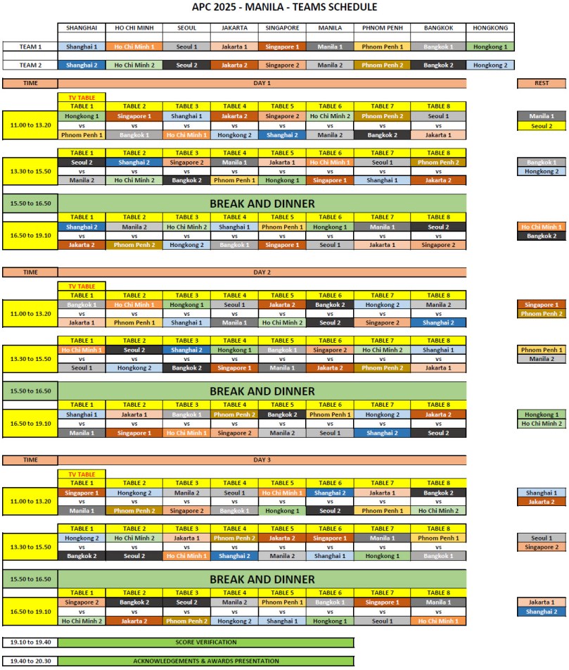 With just 20 days to go before the start of our epic 9 teams APC 2025 in Midas Hotel, Manila, Philippines, here are the schedules for the Singles and Teams competitions. For those who won’t be able to attend live, don’t worry you will be able to watch the matches on our TV table #1 live streamed from the comfort of your home, or even better with your friends at your local bar (participating bars list coming soon).
