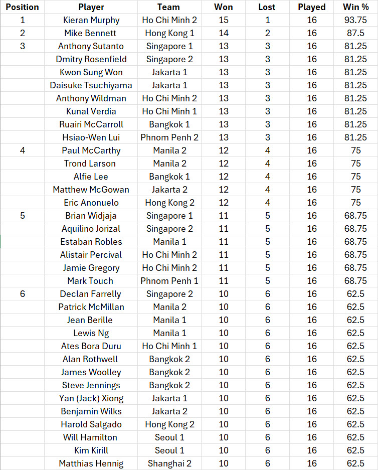 PLAYER RANKINGS – APC 2025 For players who played a minimum of 12 frames out of a possible 16. Share this: Click to share on X (Opens in new window) X Click to share on Facebook (Opens in new window) Facebook Like Loading...